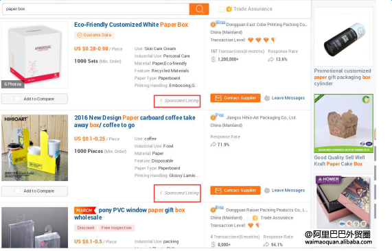 www.alibaba.com 搜索關(guān)鍵詞 paper box為例,P4P展示位置如下: