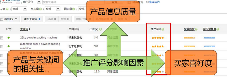 推廣評分,即產(chǎn)品星級。是指關(guān)鍵詞和產(chǎn)品的相關(guān)程度以及產(chǎn)品的信息質(zhì)量,是影響產(chǎn)品展現(xiàn)區(qū)域以及排名的重要因素之一。